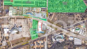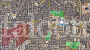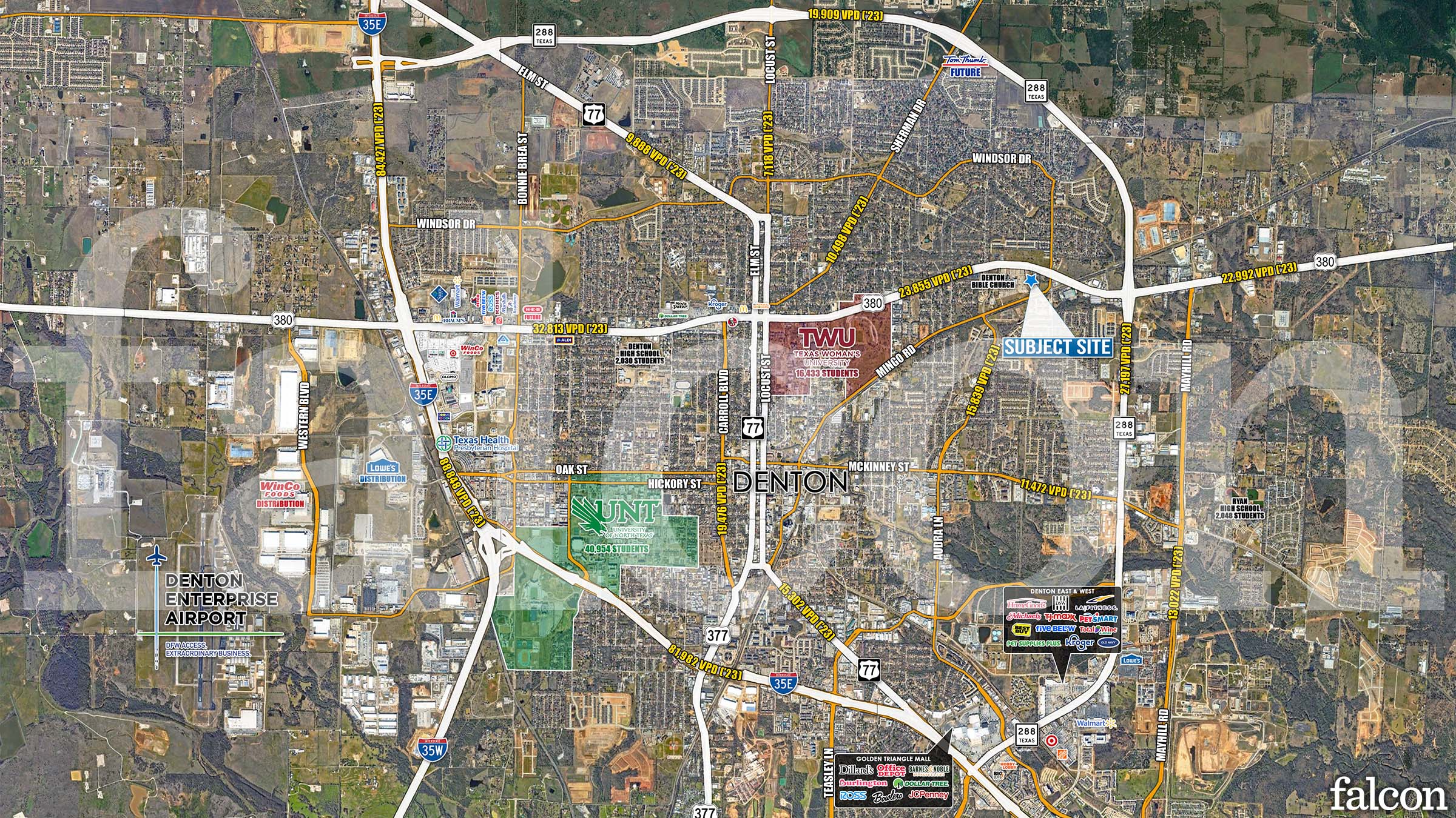 Highway 380 frontage at a signalized intersection near Denton Bible Church, Texas Womens University, and University of North Texas.