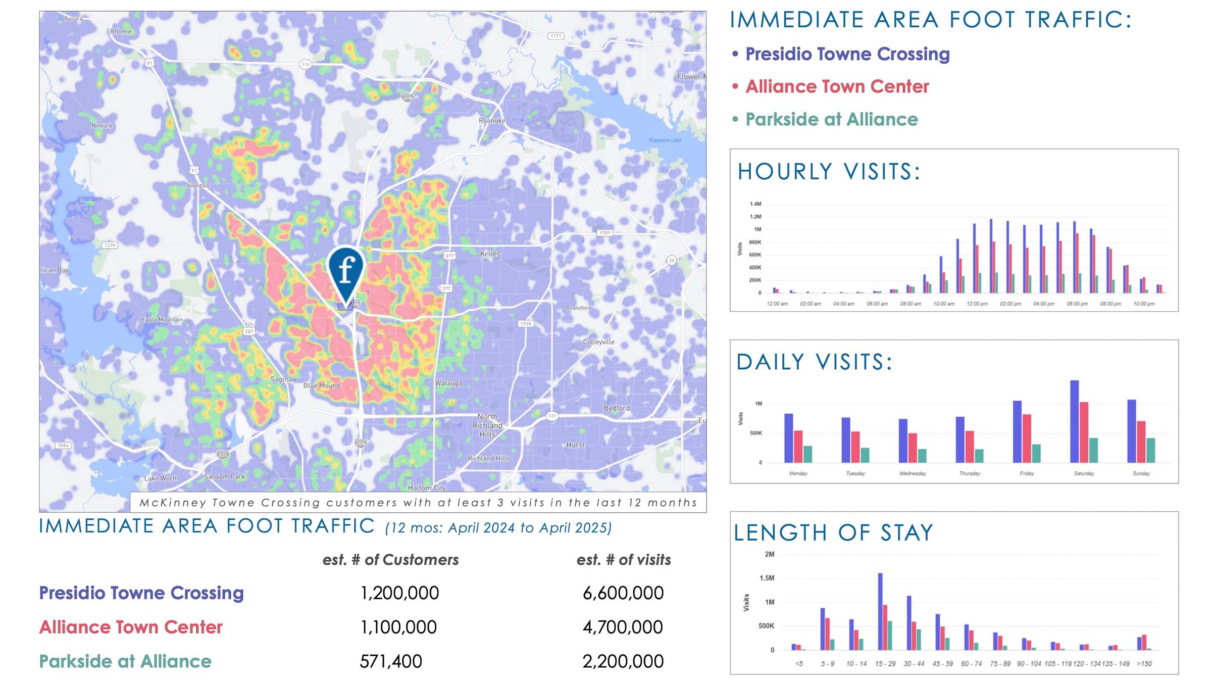 • Close to Presidio Towne Crossing (6,600,000 visits), Alliance Town Center (4,700,000 visits), and Parkside at Alliance (2,200,000 visits).