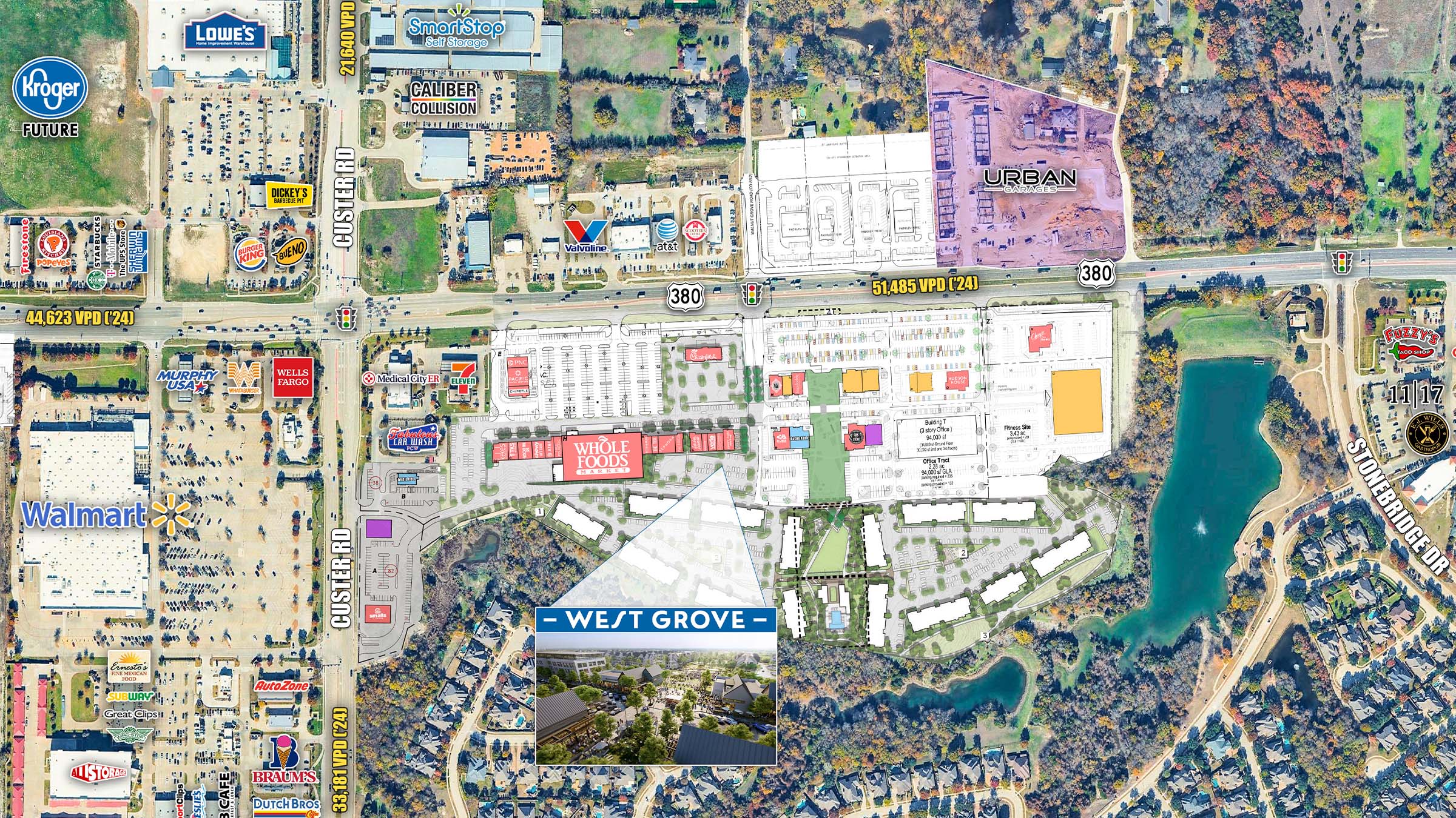 WEST GROVE is a 500,000 square foot Whole Foods anchored retail, restaurant and entertainment destination located at the southeast corner of US Hwy 380 and Custer Road in McKinney, TX.