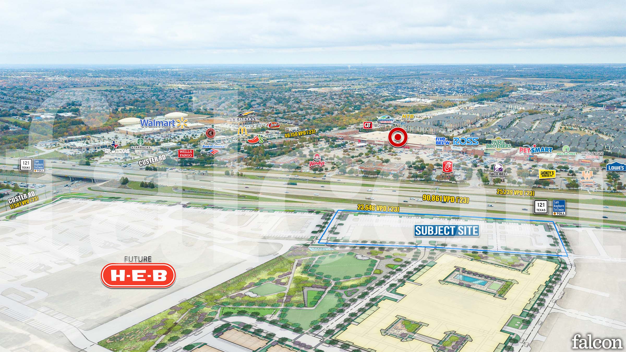 Pad site opportunities fronting SH-121 adjacent to future HEB, Urban Park, and Custer 121 multifamily development. Nearby traffic generators include McDermott Towne Crossing, McKinney Towne Crossing, Target, and Walmart.