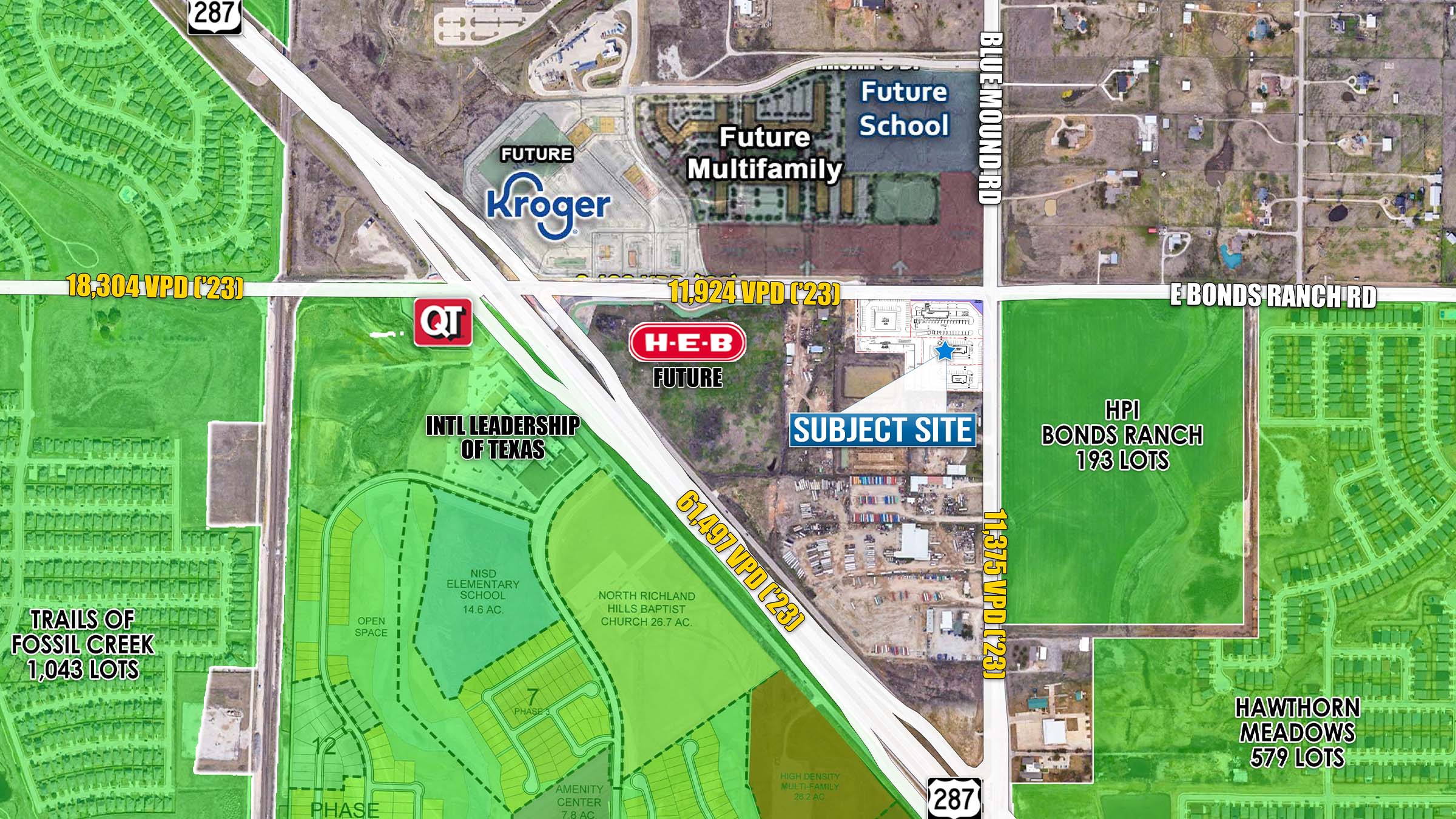 Multiple pad sites available in Fort Worth at the SWQ of Blue Mound Rd and Bonds Ranch Rd. Nearby major retail developments in a rapidly growing area include a new Kroger, HEB, and many shopping centers. Surrounded by new residential developments including Berkshire (766 lots) and HPI Bonds Ranch (193 lots).