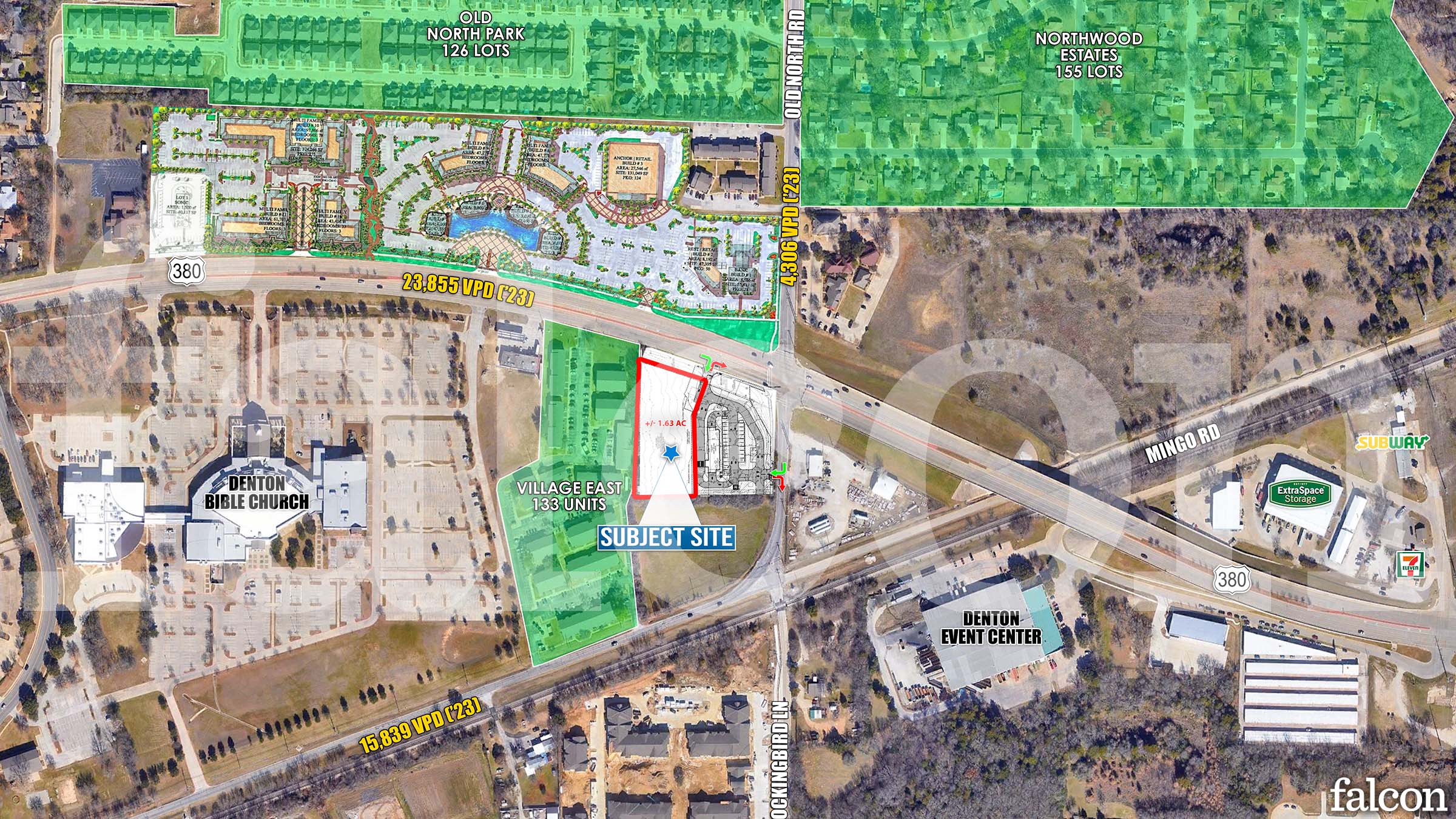Pad site opportunity with Highway 380 frontage at the signalized intersection of 380 & Mingo/Old North Rd near Denton Bible Church, Texas Womens University, and University of North Texas.
