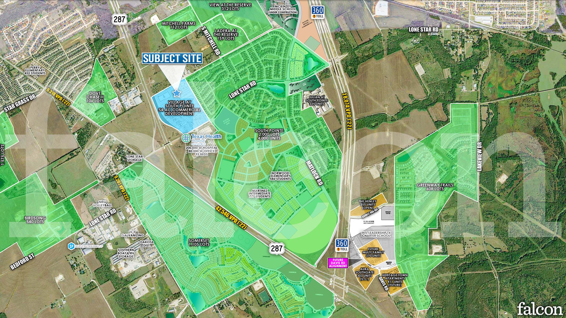 +/- 54 Acre Tract Available with excellent visibility to Highway 287 across from Texas Health Hospital. Located at the entrance of the recently developed 870-acre, South Pointe subdivision which is the largest luxury, master-planned community in south DFW. Future mixed-use development to include retail, restaurant, entertainment, multi-family, and medical office components.