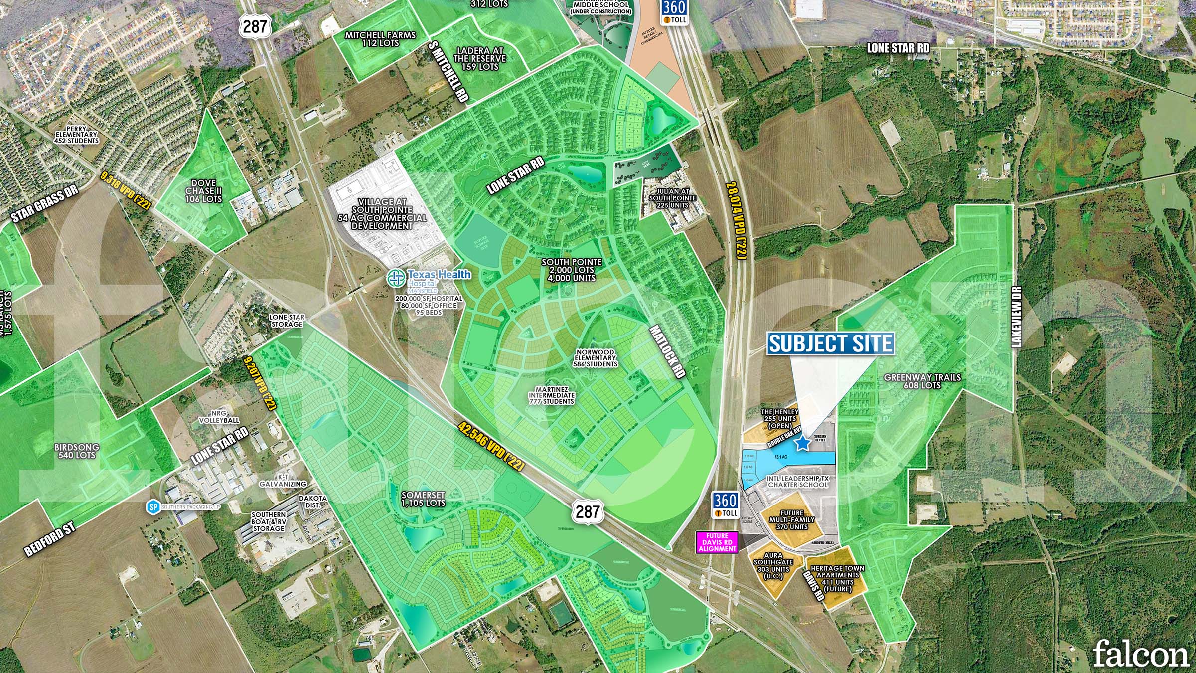 +/- 54 Acre Tract Available with excellent visibility to Highway 287 across from Texas Health Hospital. Located at the entrance of the recently developed 870-acre, South Pointe subdivision which is the largest luxury, master-planned community in south DFW. Future mixed-use development to include retail, restaurant, entertainment, multi-family, and medical office components.