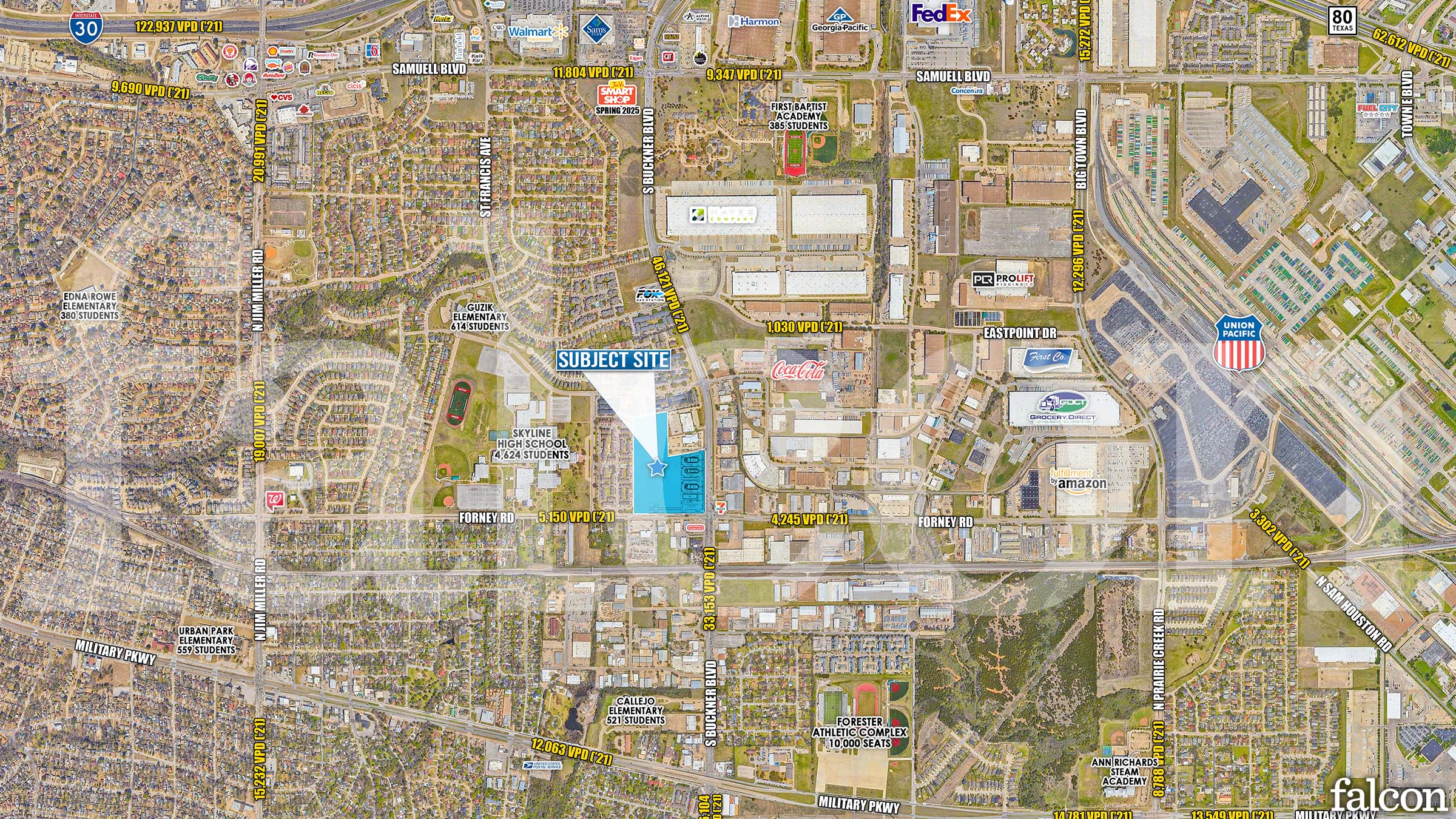17 acre tract for sale (pad sites available) at the NWQ of S Buckner Blvd and Forney Rd in Dallas, TX. Nearby traffic generators include Skyline High School, Coca-Cola Bottling Co., Forester Athletic Complex, Walmart, Sam’s Club, and future Joe V’s Smart Shop Grocery (HEB).